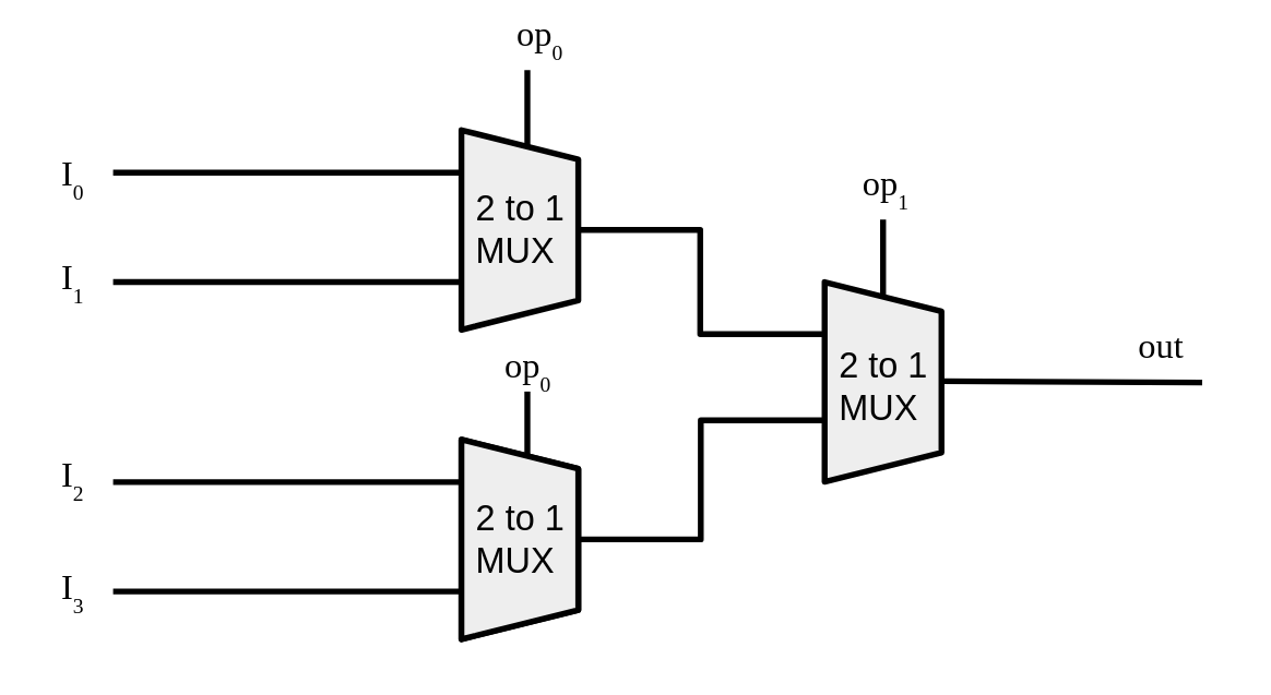 In order to complete the ALU section, you will need to create an extension of the 2-1 MUX for it to allow 4 bit inputs with a 2 bit selection signal to choose the single output. The way you do this is to nest a total of 3 MUX together in the following scheme: