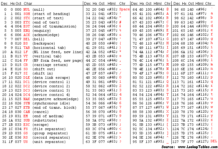 The decimal numbers between 0-31 and 128-255 char representations are now system specific, often being UTF-8, however historically it has been based off of the American Standard Code for Information Interchange (ASCII) character format, with almost all subsequent encodings respecting the following tables entries for 32-127: