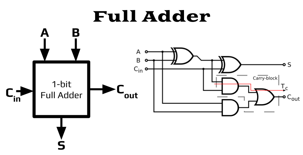 The OR at the end is needed because a carry-out can be generated by either half adder, and we want to pass it along if either one fires.